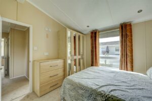 In the bedrooms there are 2 double rooms. The main room has a double bed with bedside storage, a striking headboard. There is also a dressing table with matching upholstered stool, which is great for getting ready.